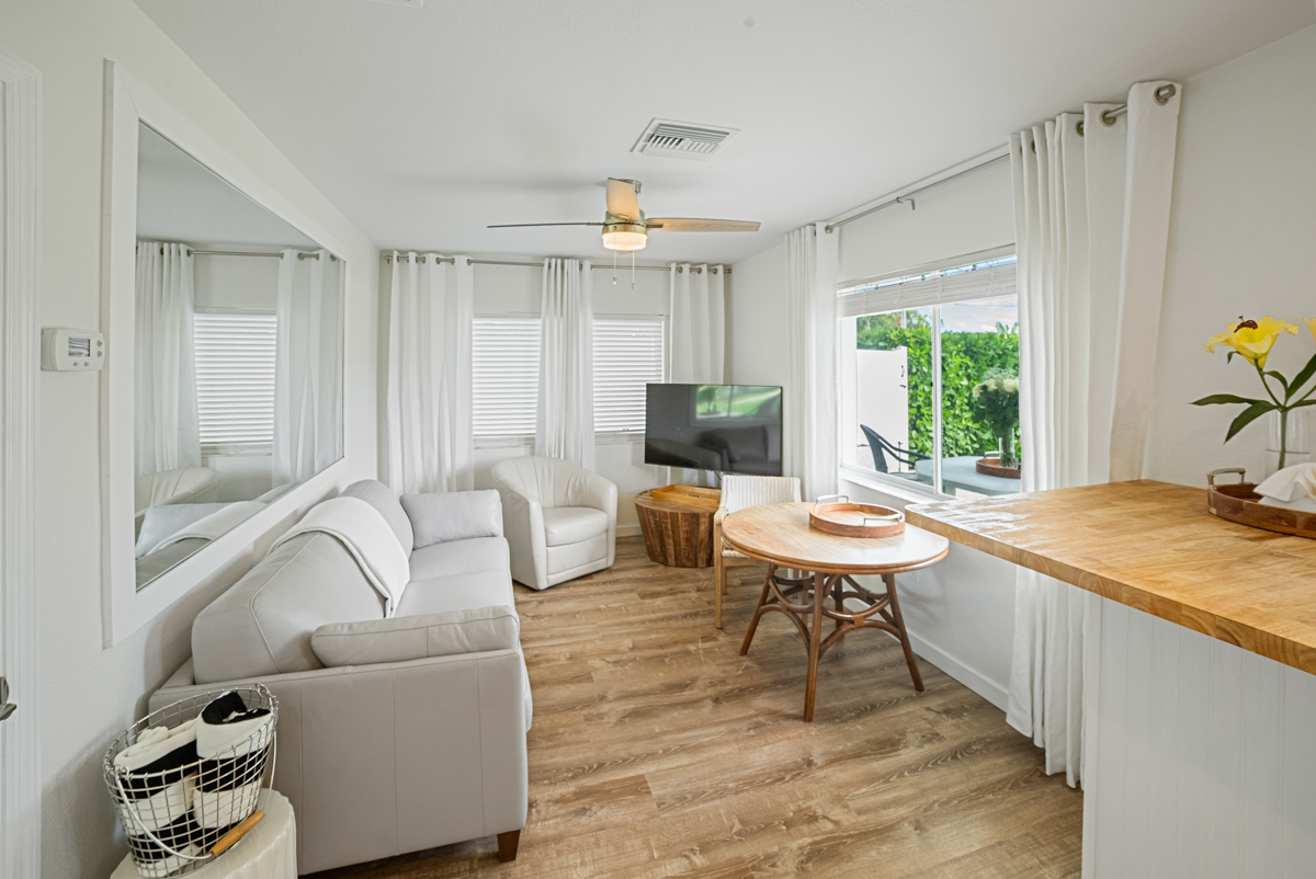 Situated along a tranquil canal with seamless access to the stunning Sarasota Intracoastal Waterway, just steps from the Venice Inlet to the Gulf of America, the Beachside One Bedroom Bungalow at Casey Key Resort epitomizes refined coastal living. Recently reimagined, this elegant retreat blends modern sophistication with the timeless allure of “Old Florida.” Unwind on your private outdoor terrace, where water views and gentle Gulf breezes create a serene escape. Inside, indulge in the luxury of a Tempurpedic queen-size bed, a cozy living area, a fully equipped kitchenette, and a spacious roll-in shower, all complemented by fresh marble flooring.